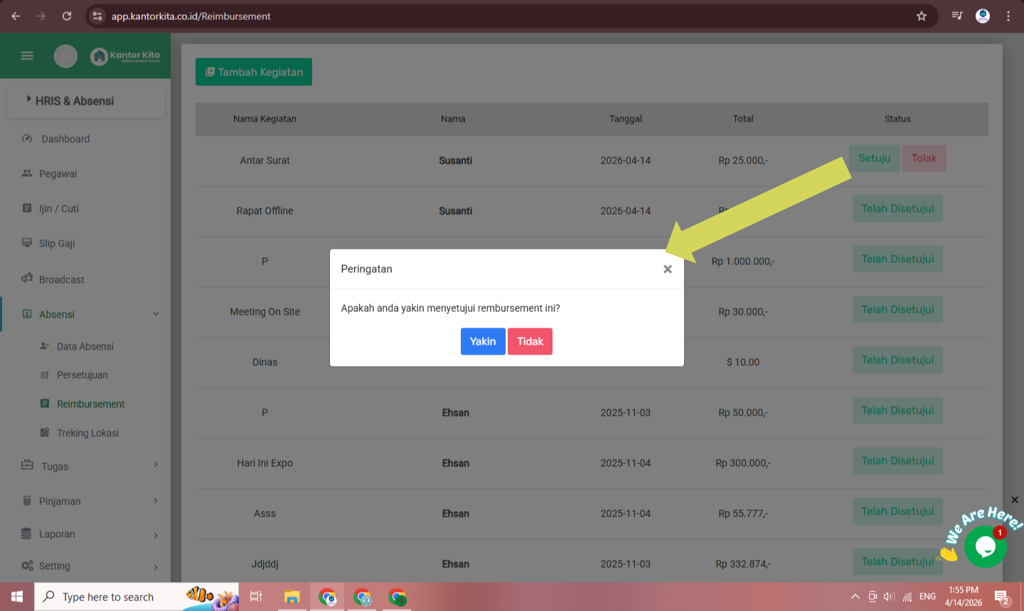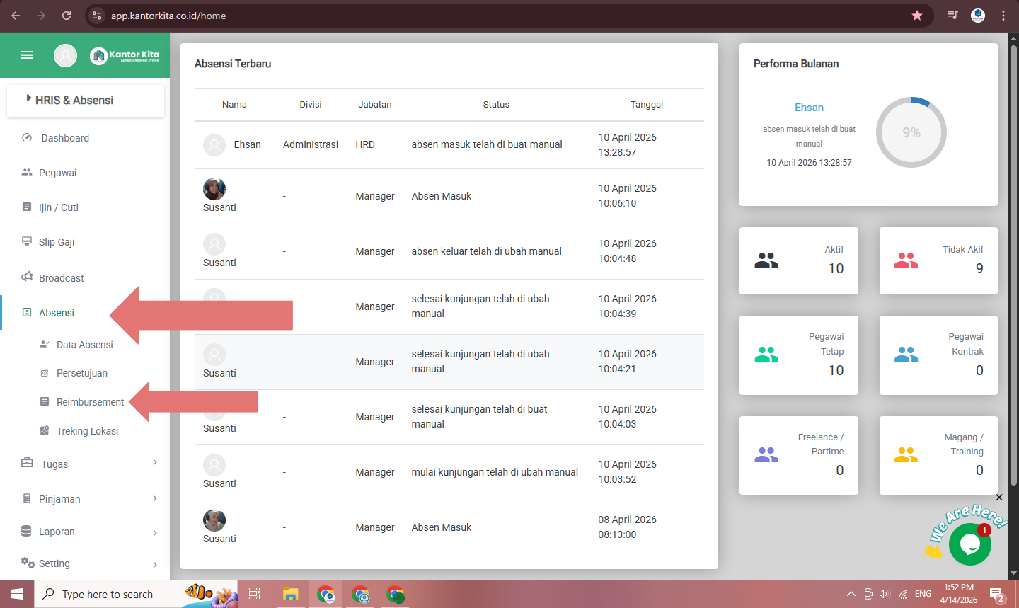 Setelah berhasil login, Anda akan sampai di halaman utama dashboard admin. Klik pada menu ‘Absensi’, kemudian klik pada ‘Reimbursement’.
