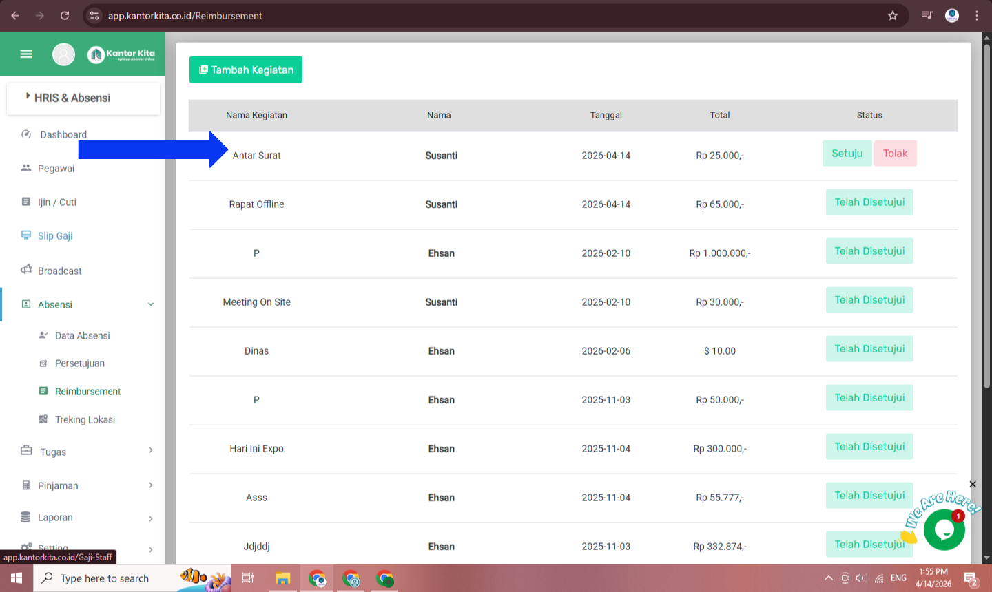 Jika Anda adalah seorang admin, HR, atau pemilik dari perusahaan yang telah terdaftar di Kantor Kita, ada beberapa hal yang harus Anda perhatikan untuk kelancaran pencatatan kehadiran karyawan. Salah satunya adalah cara menyetujui reimbursement yang diajukan oleh karyawan Anda. Sebelumnya, karyawan Anda telah mengajukan reimbursement melalui aplikasi absensi yang terdapat pada ponsel masing-masing. Selanjutnya, tugas Anda adalah menyetujui atau menolak pengajuan tersebut.