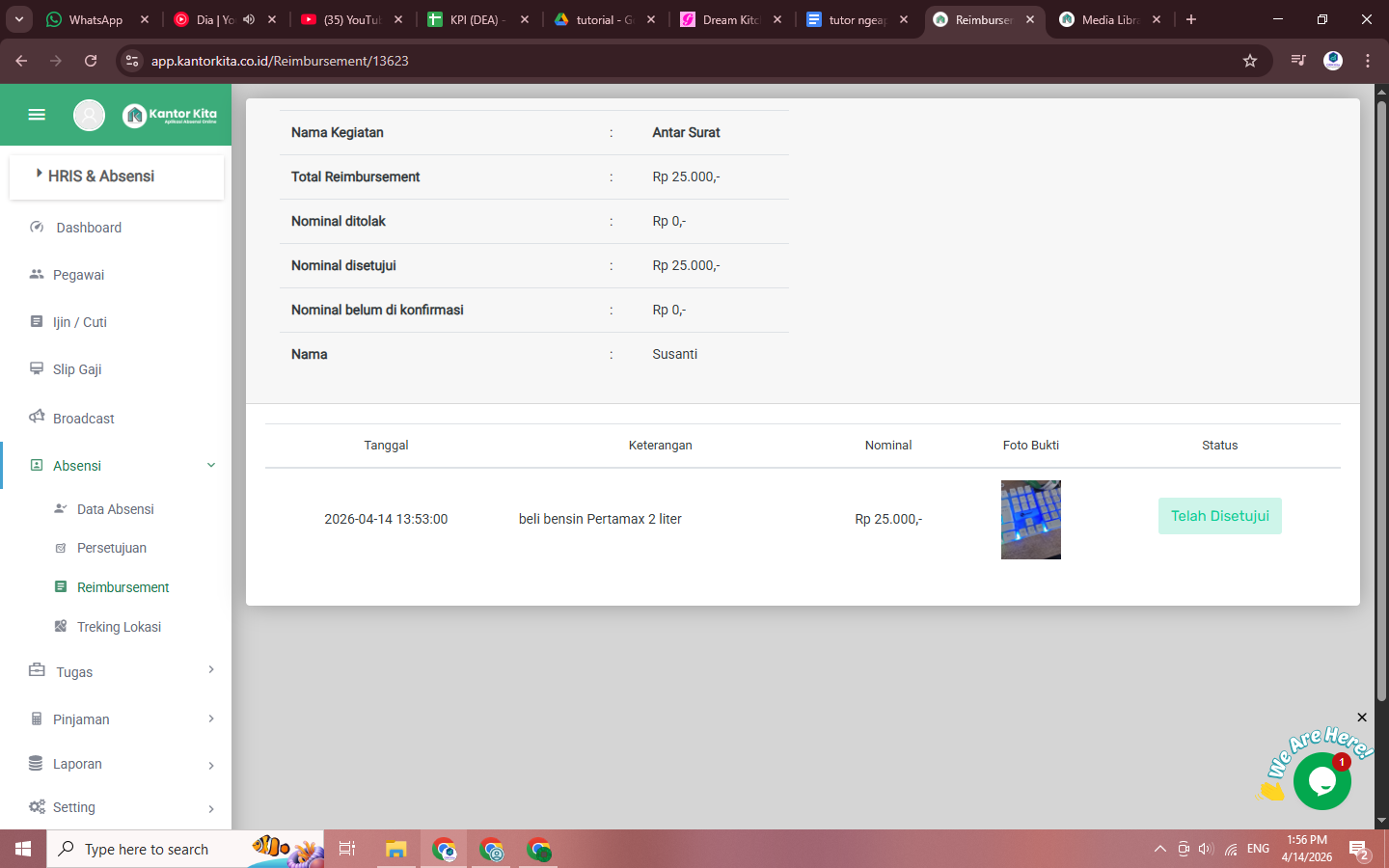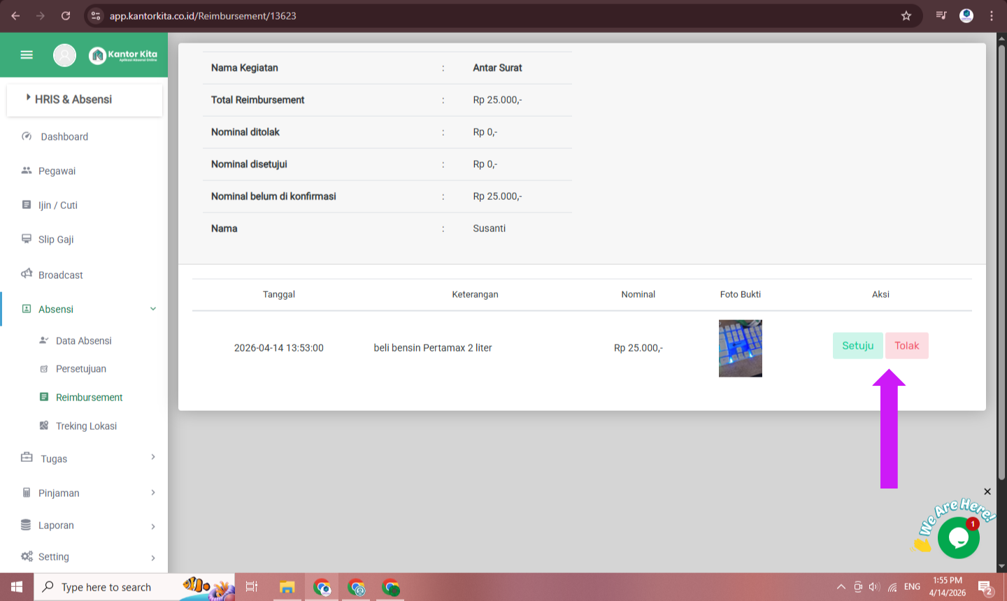 Jika ingin melihat detail pengajuan, Anda dapat mengklik pada data reimbursement terbaru. Berikut adalah tampilan detail pengajuan reimbursement. Anda dapat melihat nominal reimbursement, keterangan, dan bukti transaksi. Anda dapat klik setuju atau tolak untuk memproses pengajuan ini.