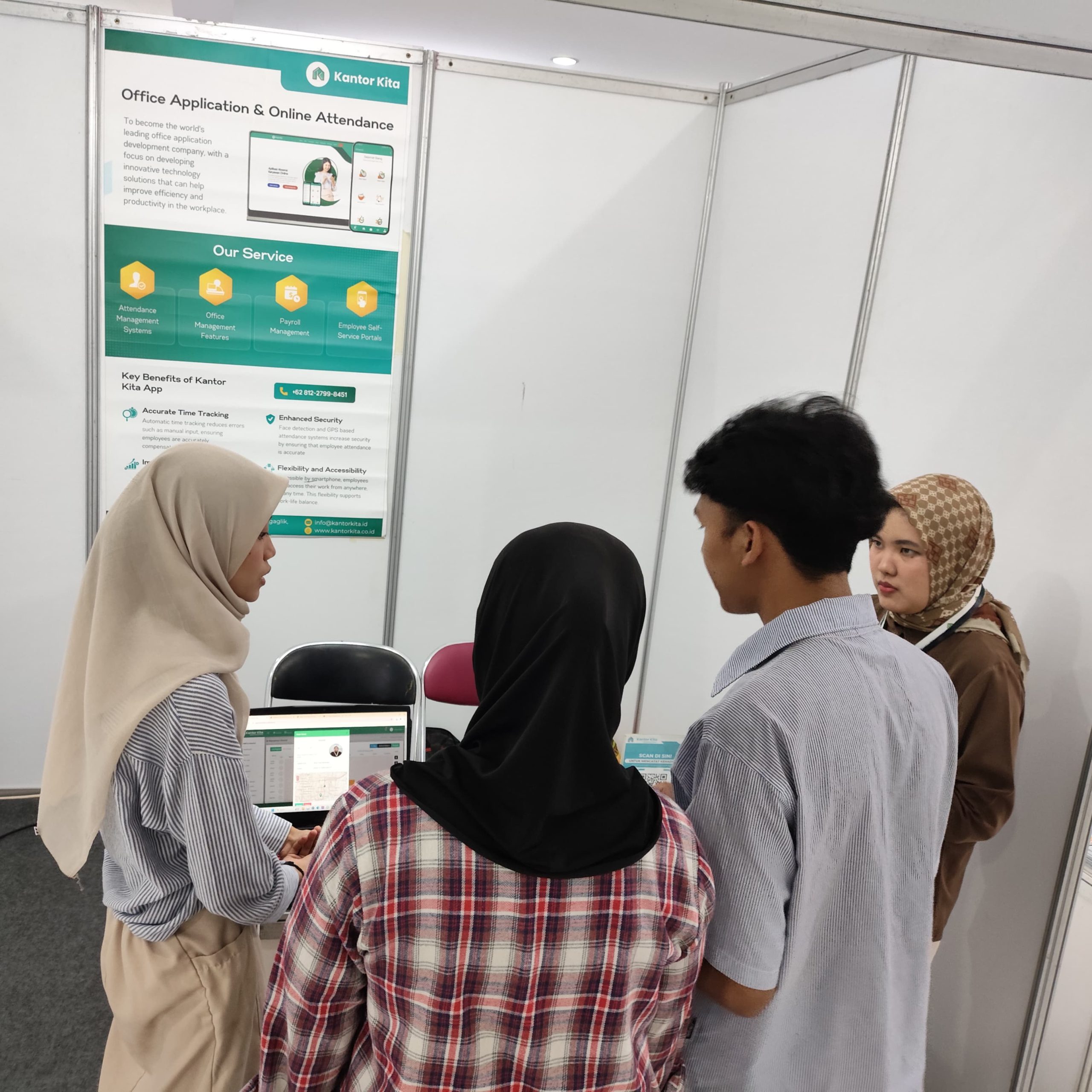 Selain memperkenalkan fitur, Kantor Kita juga menyediakan sesi demo langsung bagi pengunjung yang ingin mencoba penggunaan aplikasi secara langsung. Tim Kantor Kita memberikan penjelasan mengenai proses implementasi sistem digital dalam operasional perusahaan, termasuk bagaimana aplikasi dapat disesuaikan dengan kebutuhan dan skala bisnis masing-masing. Interaksi ini memberikan gambaran nyata kepada pengunjung mengenai manfaat penggunaan sistem HR digital dalam aktivitas kerja sehari-hari.