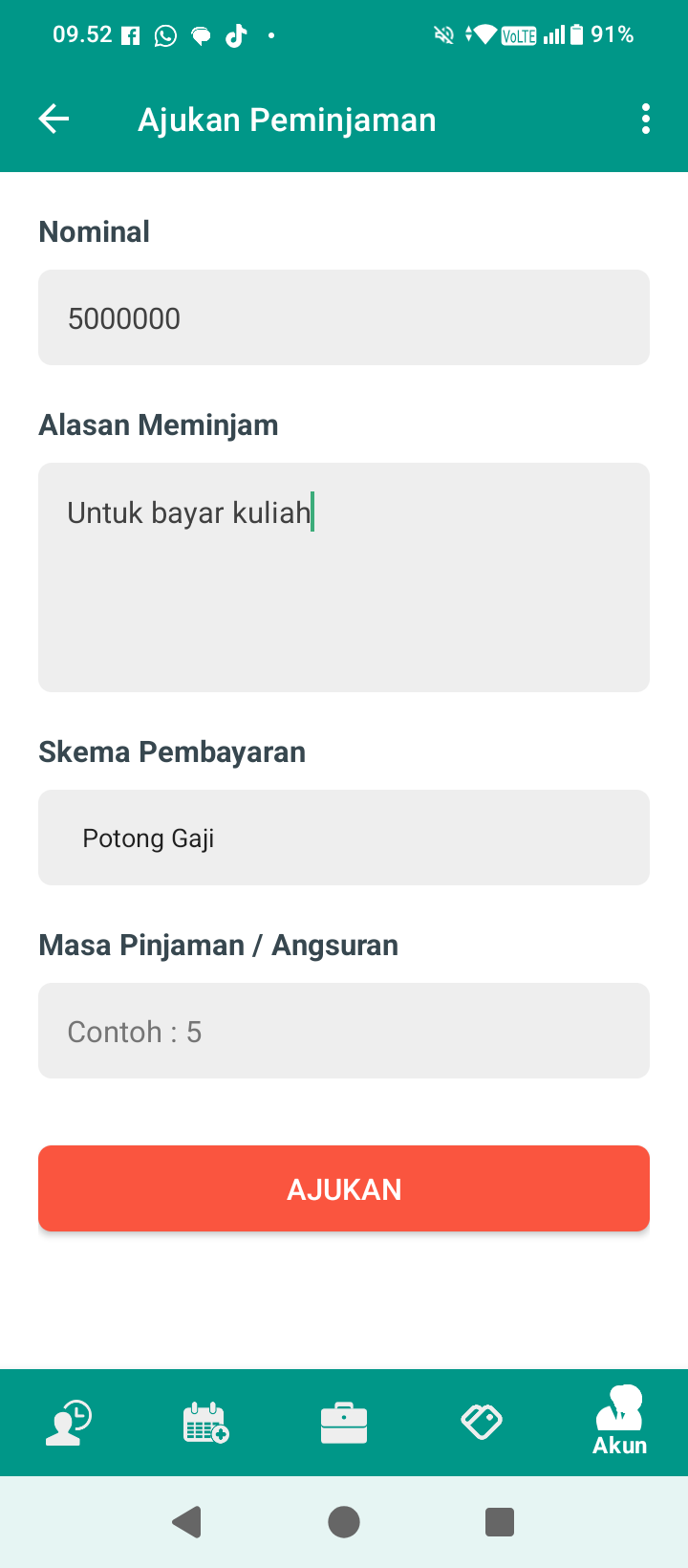 Setelah seluruh kolom terisi, Anda dapat klik tombol merah untuk mengajukan pinjaman. Anda akan diberitahu oleh admin/HR mengenai persetujuan atau penolakan pengajuan pinjaman.