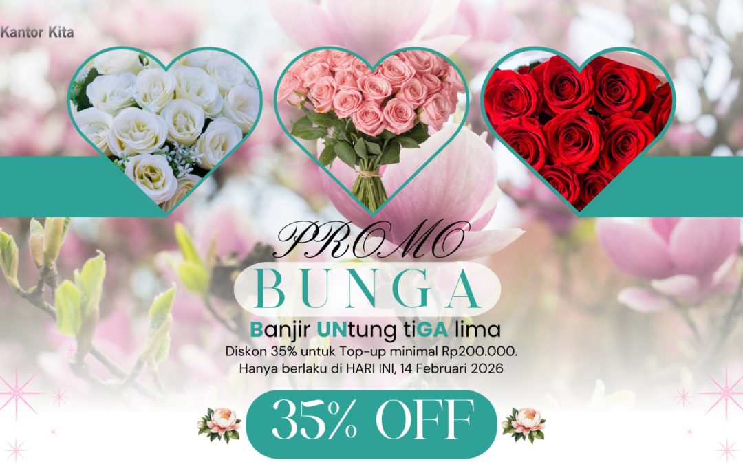 Promo BUNGA adalah program spesial Valentine dari Kantor Kita yang memberikan potongan harga hingga 35% bagi Anda yang ingin melakukan top-up saldo.